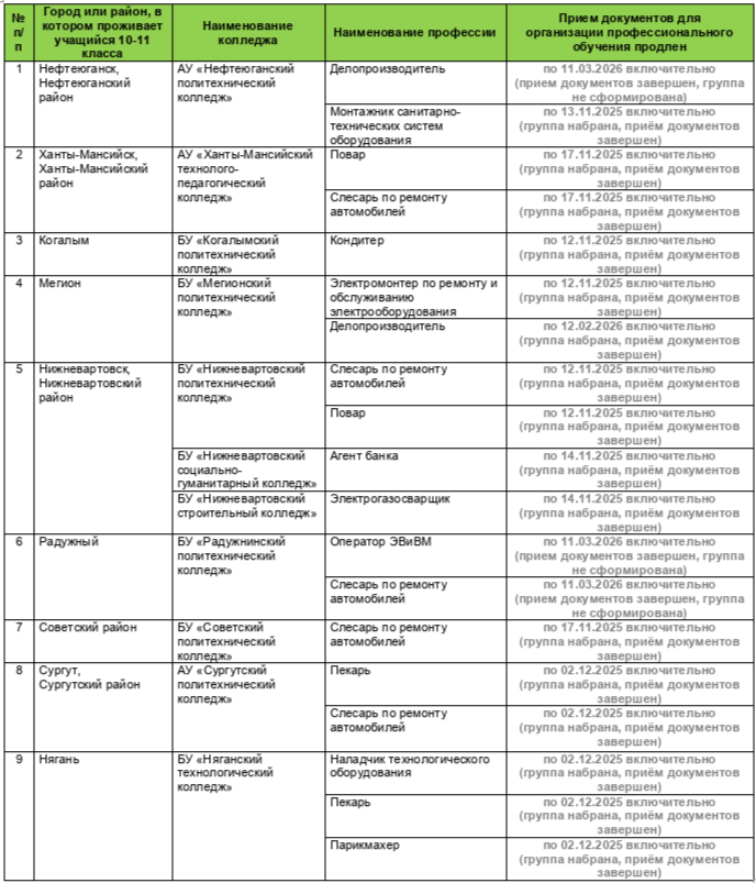 Уважаемые учащиеся 10-11 классов и их законные представители, в целях осуществления донабора в учебные группы для организации профессионального обучения сообщаем о продлении территориальными центрами занятости населения автономного округа приема документов: