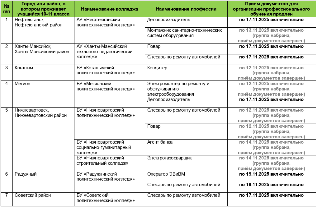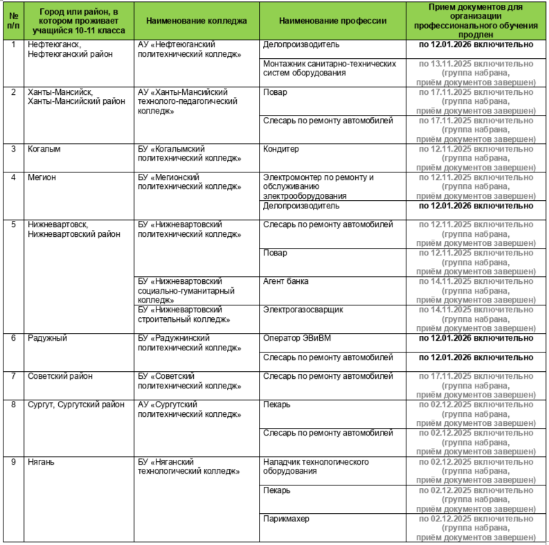 Уважаемые учащиеся 10-11 классов и их законные представители, в целях осуществления донабора в учебные группы для организации профессионального обучения сообщаем о продлении территориальными центрами занятости населения автономного округа приема документов: